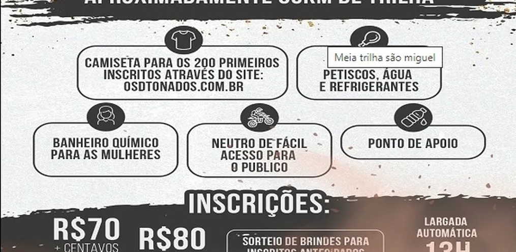 Neste final de semana, sábado, dia 4, o Moto Grupo Acelera São Miguel promove a 15ª edição da Meia Trilha na comunidade de linha Aparecida. Serão mais de 70km de trilhas com vários desafios, passando por diversas outras comunidades. A trilha está bem marcada e aberta para os trilheiros acelerarem e curtirem.