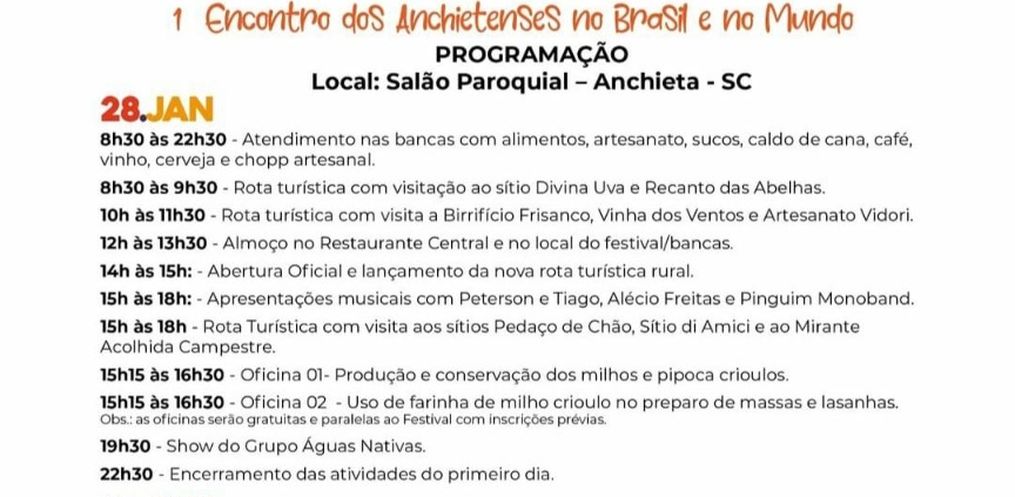 O prefeito falou que a programação terá a abertura às 08h30 de sábado encerrando às 22h30. Pela parte da manhã e começo da tarde os participantes poderão visitar as bancas e fazer visitação em propriedades rurais que estão incluídos na “Rota dos Orgânicos”. A solenidade de abertura oficial do evento acontece entre às 14h e 15h. Conforme o prefeito, a programação vai seguir pela parte tarde com apresentações culturais e oficinas. Às sete e meia da noite terá um show com o grupo Águas Nativas.
