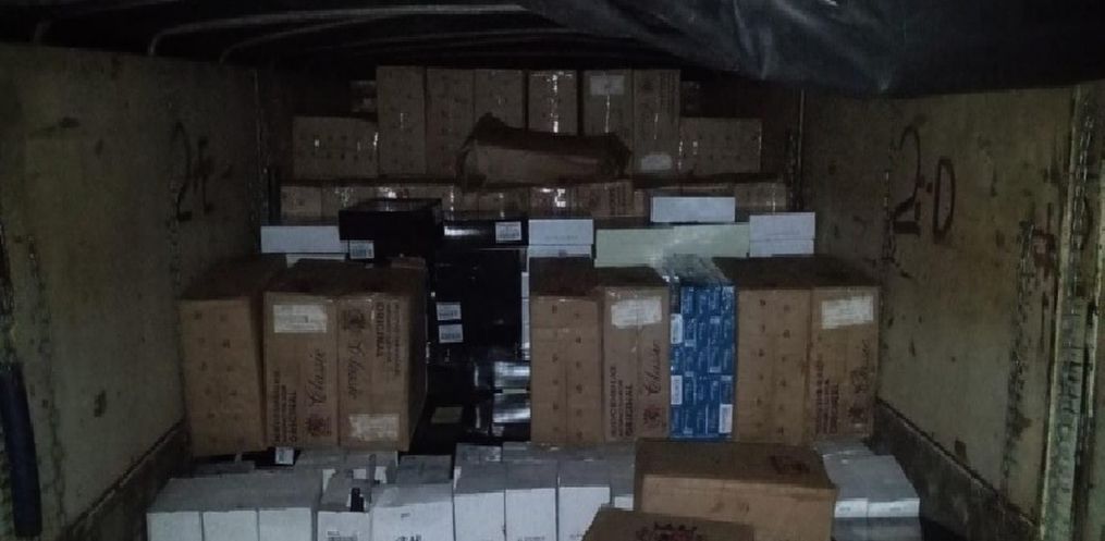 Dentro da carroceria do caminhão foram encontradas 90.000 carteiras de cigarro e 200 caixas de vinho, todos de origem estrangeira.