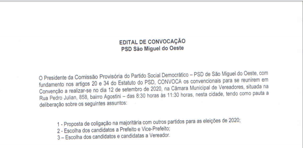 O Presidente da Comissão Provisória do Partido Social Democrático – PSD de São Miguel do Oeste, com fundamento nos artigos 20 e 34 do Estatuto do PSD, CONVOCA os convencionais para se reunirem em Convenção a realizar-se no dia 12 de setembro de 2020, na Câmara Municipal de Vereadores, situada na Rua Pedro Julian, 858, bairro Agostini – das 8:30 horas às 11:30 horas, nesta cidade, tendo como pauta a deliberação sobre os seguintes assuntos: