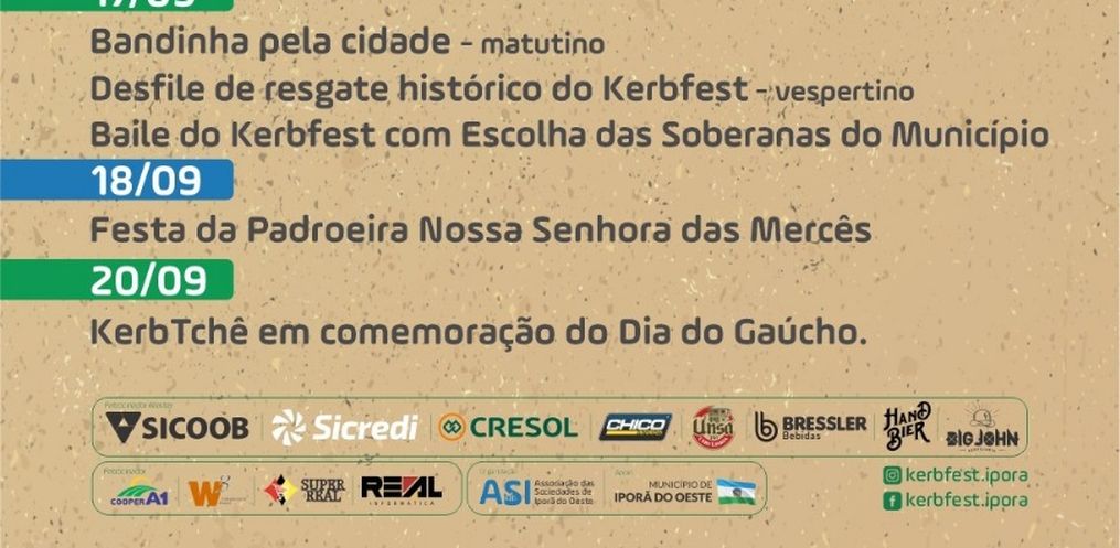 17/09 - bandinhas típicas pelas ruas da cidade na parte da manhã, desfile com resgate histórico da Kerbfest durante a tarde e grande baile de Kerb com escolha das novas soberanas à noite no ginásio poliesportivo.