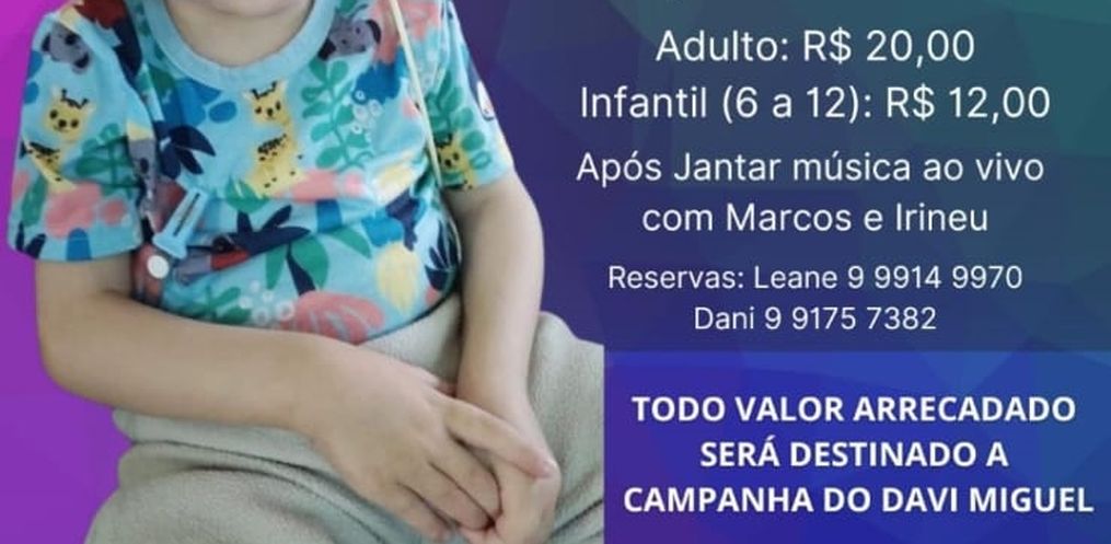 Também será realizado um jantar beneficente no dia 18 de março, na comunidade de Taipa Baixa, interior de Mondaí, onde moram os avós de Davi Miguel. O cardápio é galinhada no tacho com acompanhamentos, ao valor R$ 20,00 para adultos e R$ 12,00 para crianças de seis a 12 anos. O lucro será totalmente destinado para a família custear o tratamento de saúde.