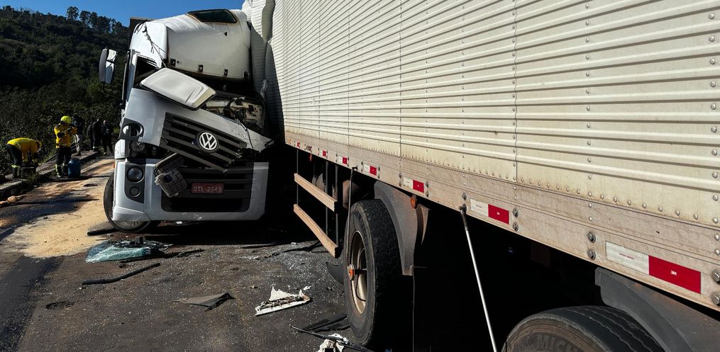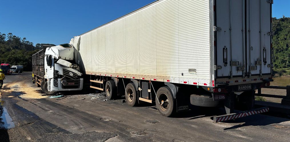 Dois motoristas ficaram feridos após uma colisão frontal entre caminhões na tarde desta quarta-feira, 2, por volta das 12h50, proximidades da ponto do Rio das Antas, na BR-282, no trecho entre São Miguel do Oeste e Maravilha, em Santa Catarina.