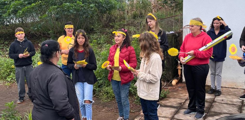 Na oportunidade foram confeccionadas margaridas amarelas que são símbolo da campanha para serem colocadas no portal de entrada do município, bem como, para distribuição para a população.