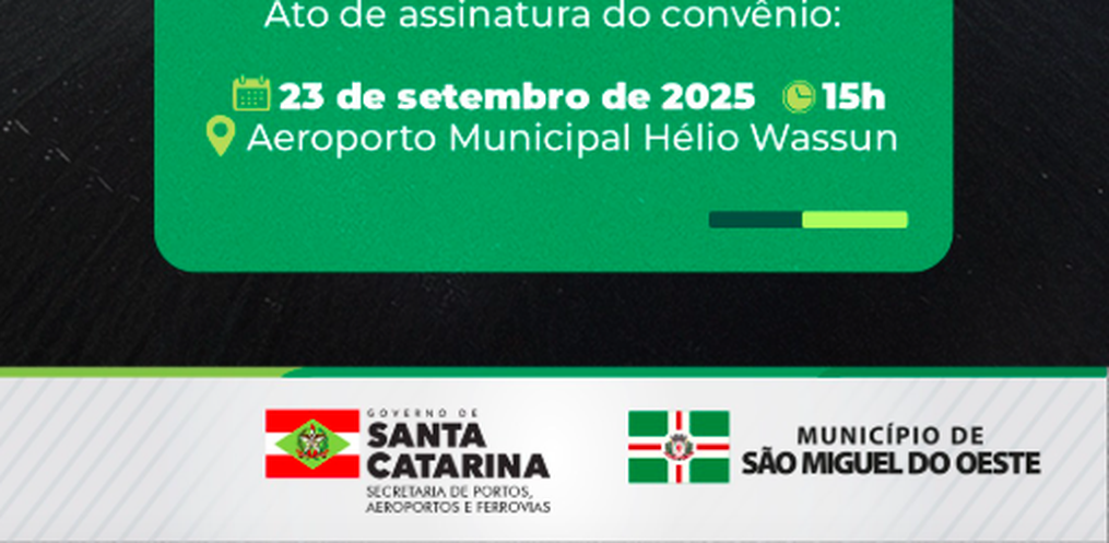 O Governo de Santa Catarina e a Prefeitura de São Miguel do Oeste assinam, na próxima terça-feira, 23, às 15h, um convênio para viabilizar novos investimentos no Aeroporto Municipal Hélio Wassun.