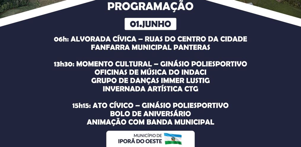 Uma programação especial marcará o aniversário de 34 anos de emancipação político-administrativa de Iporã do Oeste nesta quinta-feira, 01 de junho.