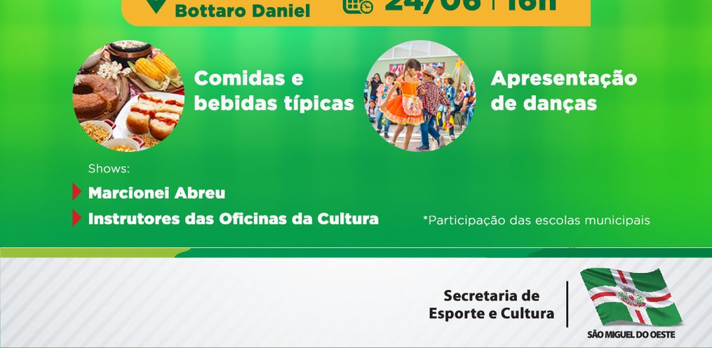 As Secretaria de Esporte e Cultura, e de Educação, finalizam os preparativos para a realização do “Arraiá de São Migué”, que acontece na praça Walnir Bottaro Daniel, neste sábado, 24, a partir das 16h.