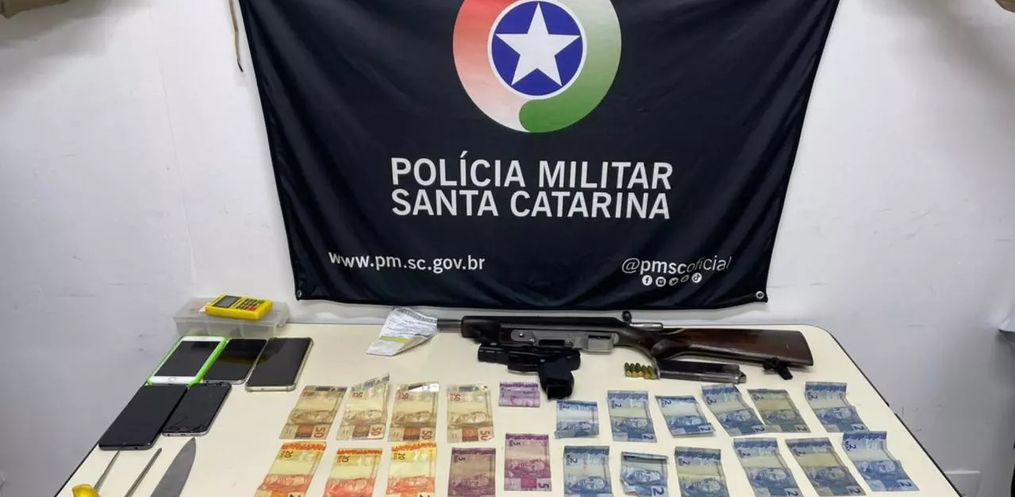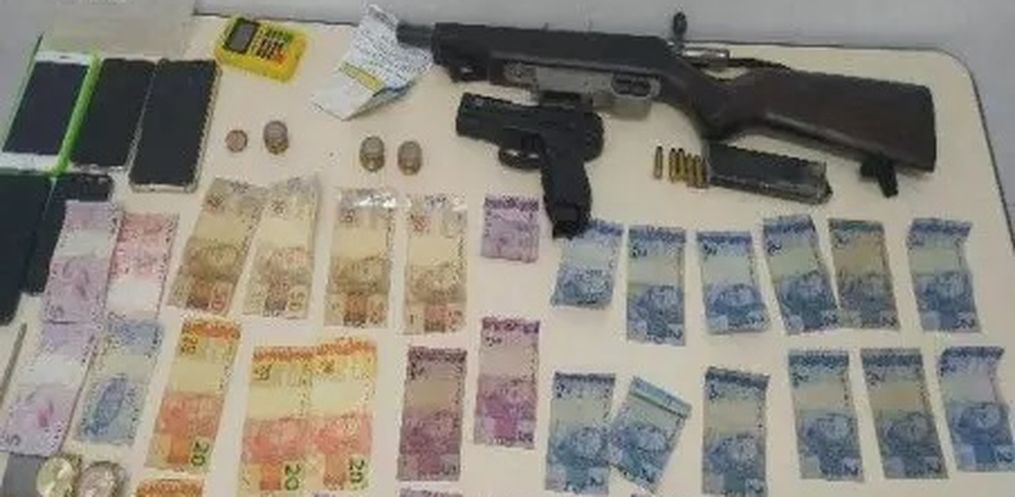 Após os assaltantes serem detidos, os policiais encontraram dentro do carro itens como armas, celulares, um simulacro, munições, facas, dinheiro, máquina de cartão de crédito, relógio, uma corrente e o cofre do estabelecimento.