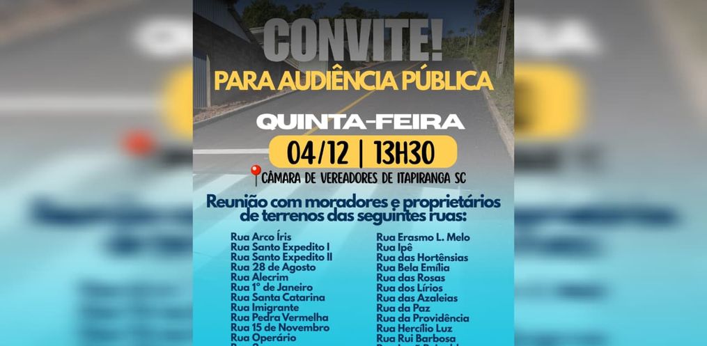 Conforme o Secretário de Administração, Sérgio Reckziegel, a audiência pública será na Câmara de Vereadores, às 13h30. É fundamental a importância da presença dos moradores, pois será o momento de esclarecer as etapas, valores e procedimentos relacionados às melhorias que serão executadas. “Os moradores terão a Contribuição de Melhoria. Isso será muito bem explicado nessa audiência” chama atenção.