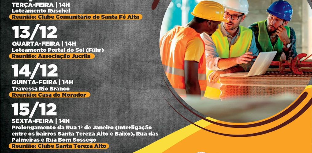 Os encontros ocorrerão entre os dias 11 e 15 de dezembro, com início às 14 horas, visando debater com os moradores que serão beneficiados sobre a legislação municipal, contribuição de melhoria e ainda assuntos gerais, para que a municipalidade possa dar seguimento aos trâmites necessários para execução dessas obras.