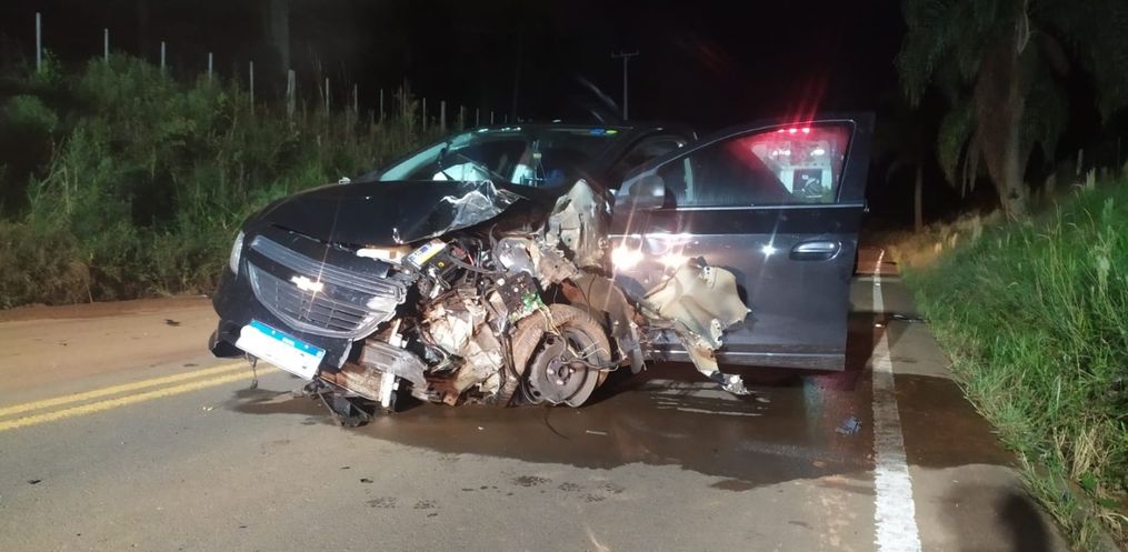 Foi uma colisão frontal/lateral entre um GM/Prisma e um caminhão Ford/Cargo carregado com leite.