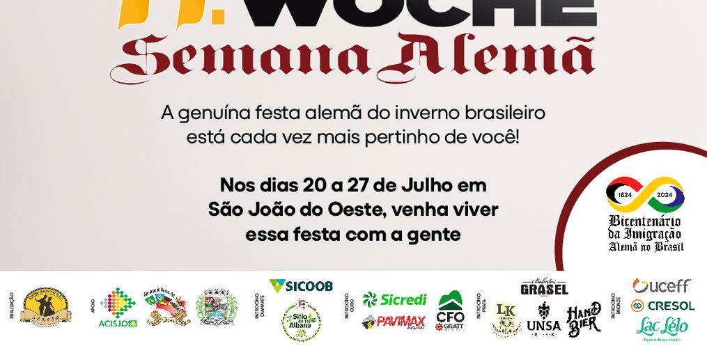 Abertura da Semana Alemã vai destacar os 200 anos da imigração alemã no Brasil. Espetáculo será apresentado no dia 20 de julho, no Ginásio Municipal de Esportes. A Deutsche Woche, a Semana Alemã, tem grande envolvimento de várias entidades do município. São João do Oeste possui o título de Capital Catarinense da Língua Alemã, com cerca de 96% da população usando o idioma para se comunicar. Conforme o Maestro da Orquestra Clave de Sol, Henrique Drebel, o Cerimonial de Abertura da décima quarta edição vai destacar as atividades culturais do município. Neste ano com a temática sobre o bicentenário da imigração alemã no Brasil. O Maestro salienta que fazem 200 anos que os primeiros colonizadores chegaram no Brasil e isso merece ser comemorado em grande estilo.