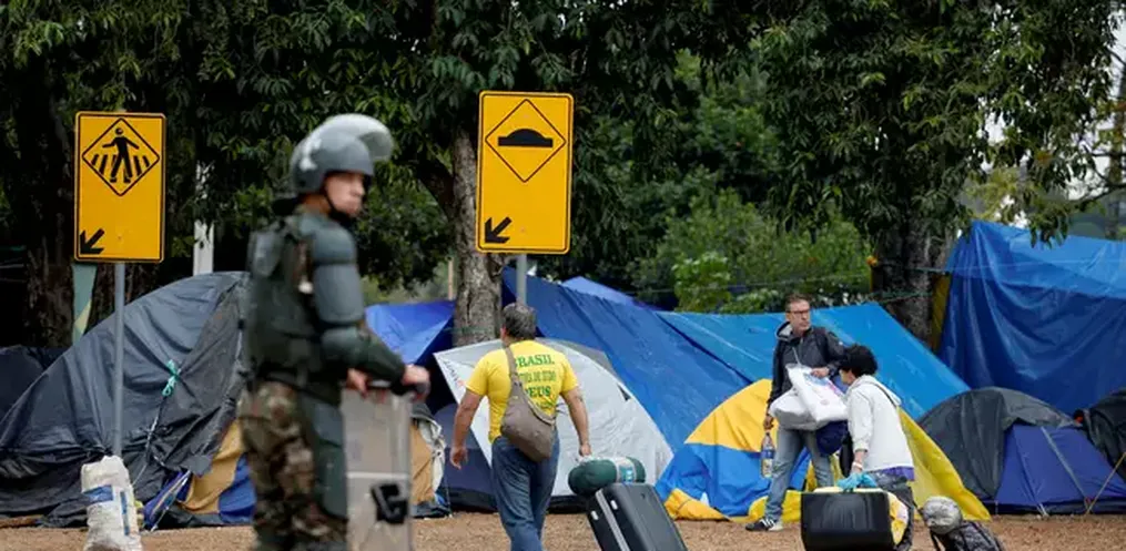 Imagens de TV mostram os agentes apenas cercando os radicais bolsonaristas, que passam a desmontar barracas, juntar pertences e deixar o local com malas.