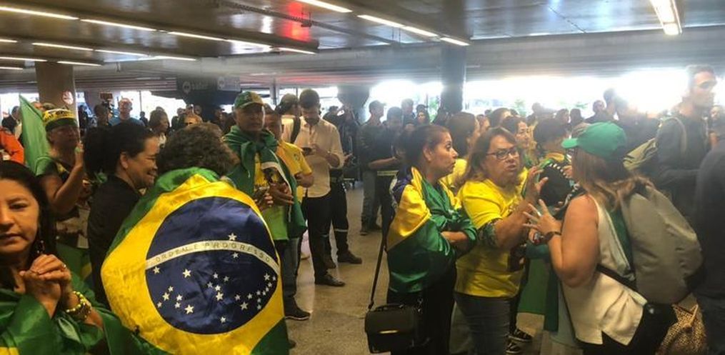 Dentro do aeroporto uma aglomeração foi formada no desembarque internacional. A PMDF formou uma barreira em frente ao portão de desembarque.