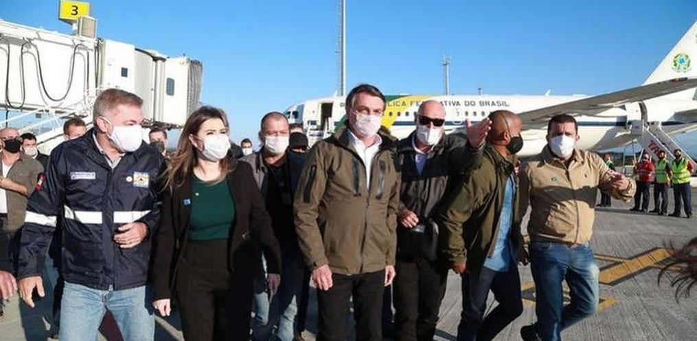 Embora o presidente tenha usado máscara durante a agenda em Santa Catarina, e a comitiva também, outros cuidados não foram observados. As fotos mostram que o distanciamento mínimo não foi respeitado. Também houve cumprimentos com aperto de mão e compartilhamento de microfone sem higienização.