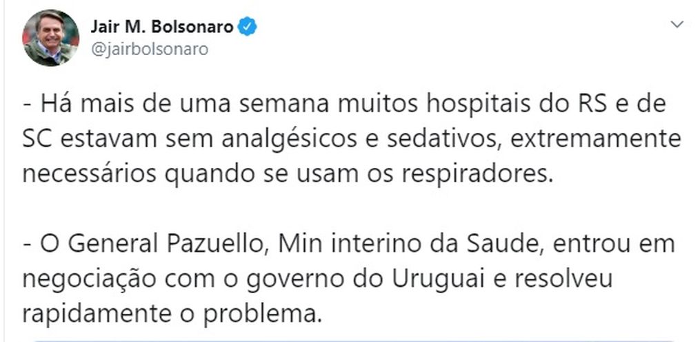 Segundo escreveu o presidente Bolsonaro no post, “há mais de uma semana muitos hospitais do RS e de SC estavam sem analgésicos e sedativos, extremamente necessários quando se usam os respiradores. O general Pazuello, ministro interino da Saúde, entrou em negociação com o governo do Uruguai e resolveu rapidamente o problema.”