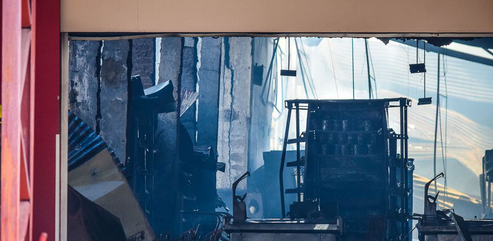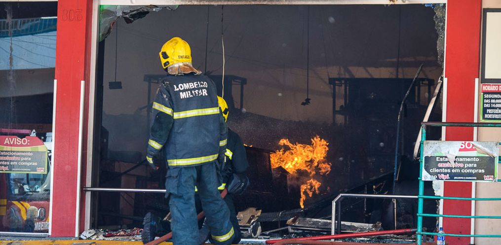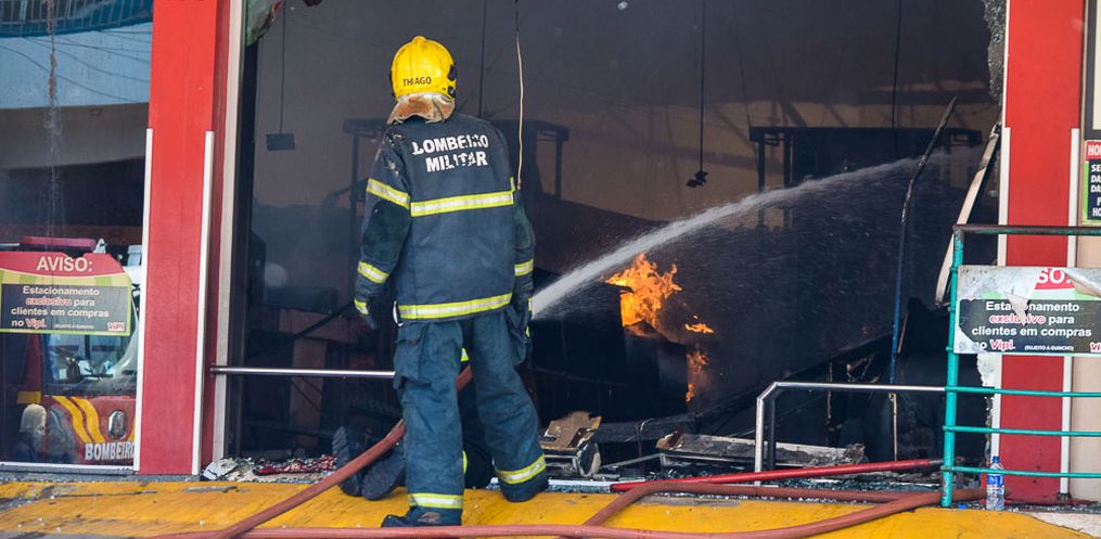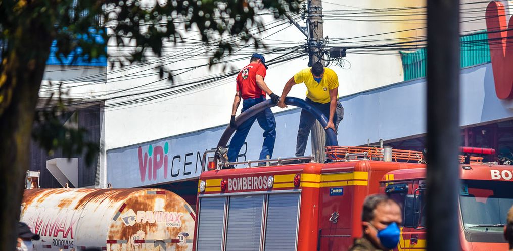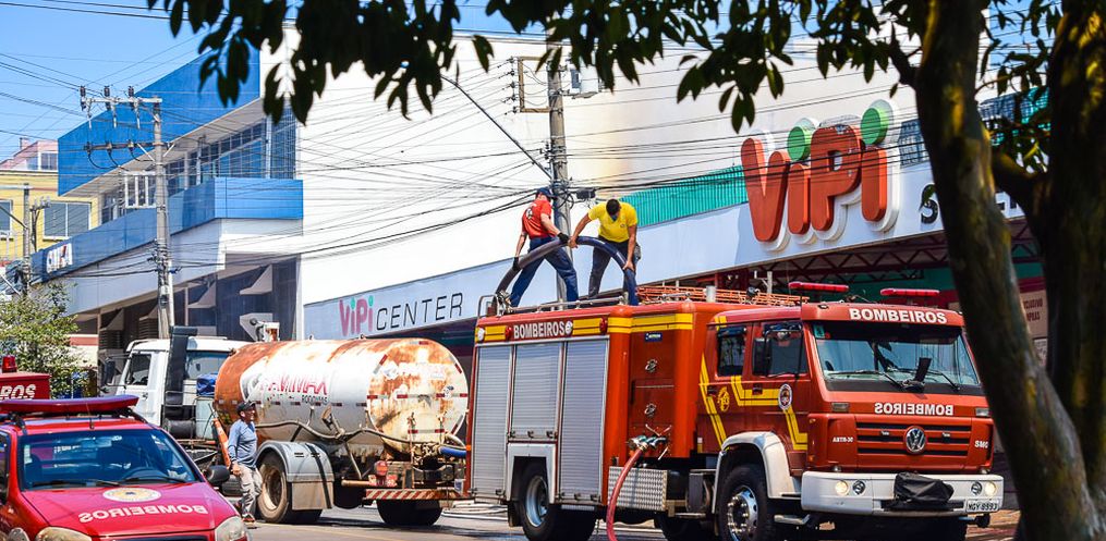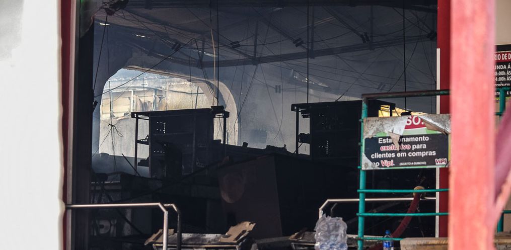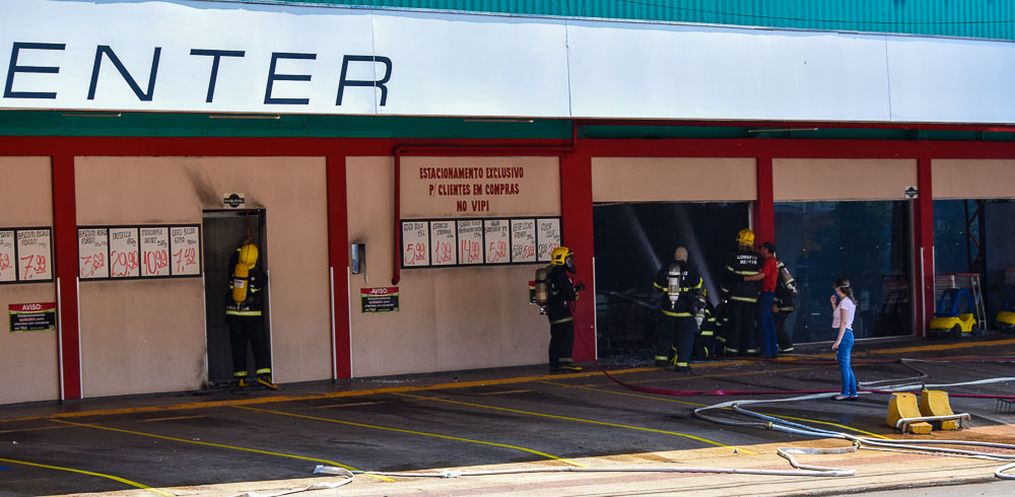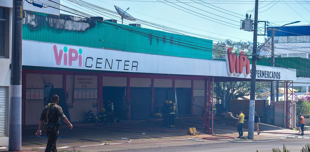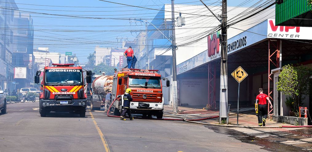 Equipes do Corpo de Bombeiro seguem no trabalho de rescaldo na tarde desta quinta-feira, 24,após o incêndio que atingiu o Super Vipi Center no começo da tarde. O fogo começou por volta das 12h no depósito.
