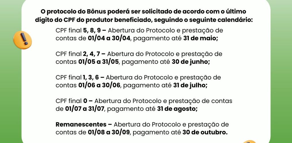O período de abertura de protocolos e a prestação de contas terão prazos definidos para diferentes grupos, sendo que para o CPF final 5, 8 ou 9, o prazo vai de 1º de abril a 30 de abril, com pagamento até 31 de maio. Para CPF final 2, 4 ou 7: de 1º de maio a 31 de maio, com pagamento até 30 de junho. Para CPF final 1, 3 ou 6: de 1º de junho a 30 de junho, com pagamento até 31 de julho, e para CPF final 0: de 1º de julho a 31 de julho, com pagamento até 31 de agosto.