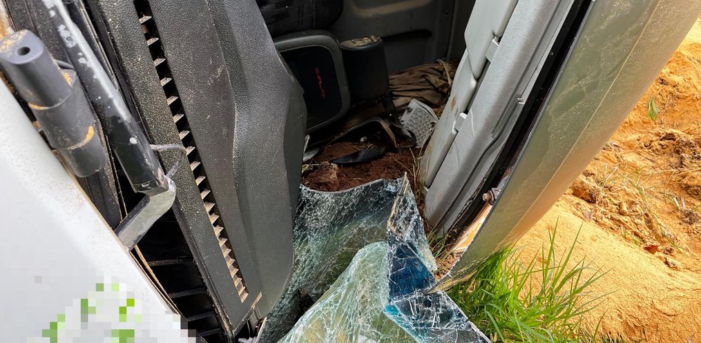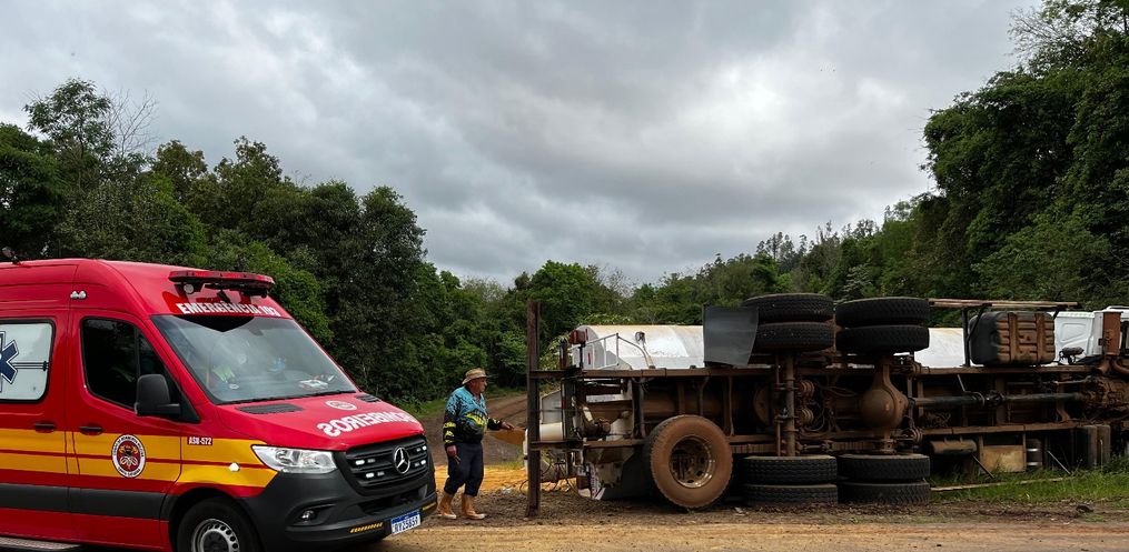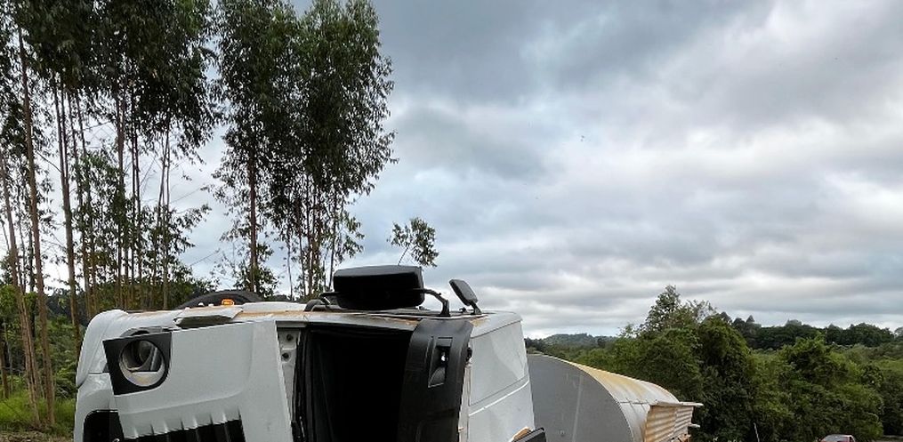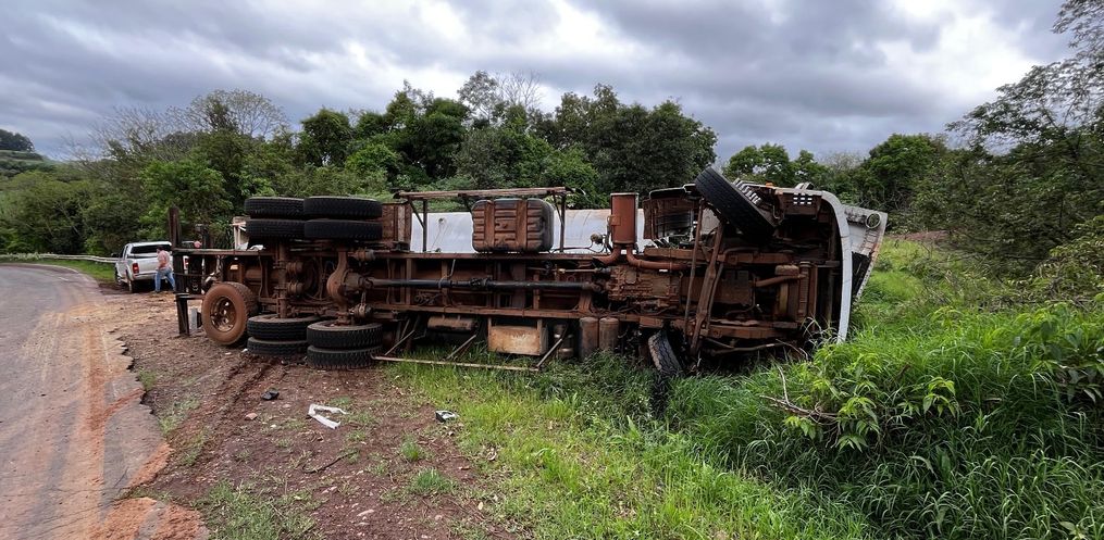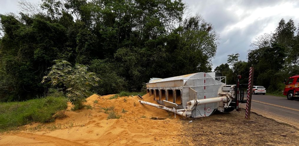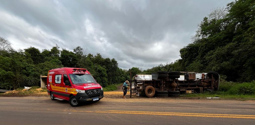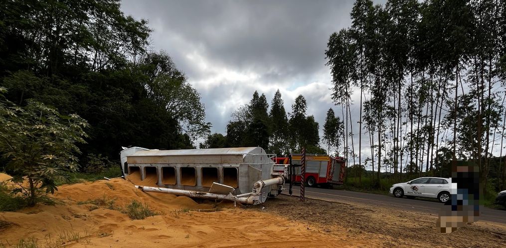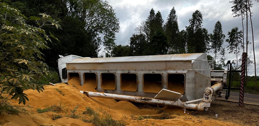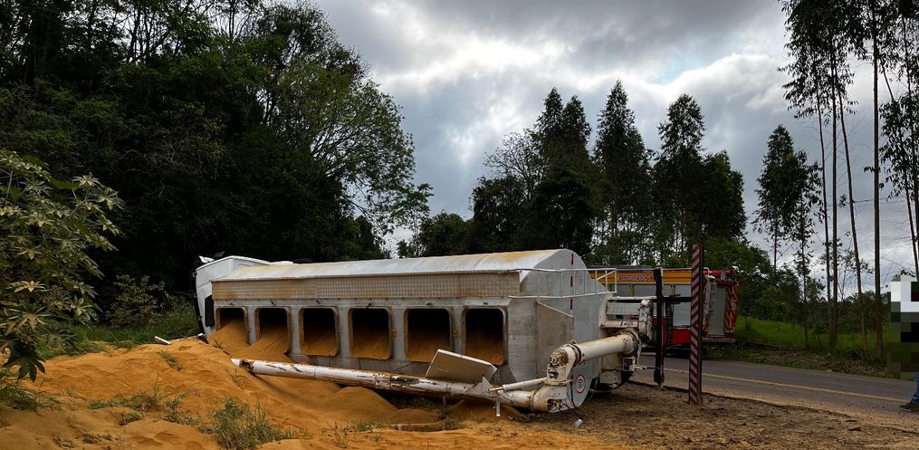 Um caminhão carregado com ração saiu da pista e tombou às margens da SC-496, entre os municípios de Descanso e Belmonte. O acidente aconteceu por volta das 15h20 desta segunda-feira, 6.