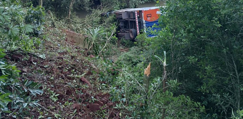 Um caminhão furgão com placas de Chapecó capotou na manhã desta segunda-feira, 24, após sair da pista na SC-161, na altura da ponte do Rio Capetinga, divisa entre Palma Sola e Campo Erê. O veículo transportava frutas e parou em uma ribanceira após o acidente.