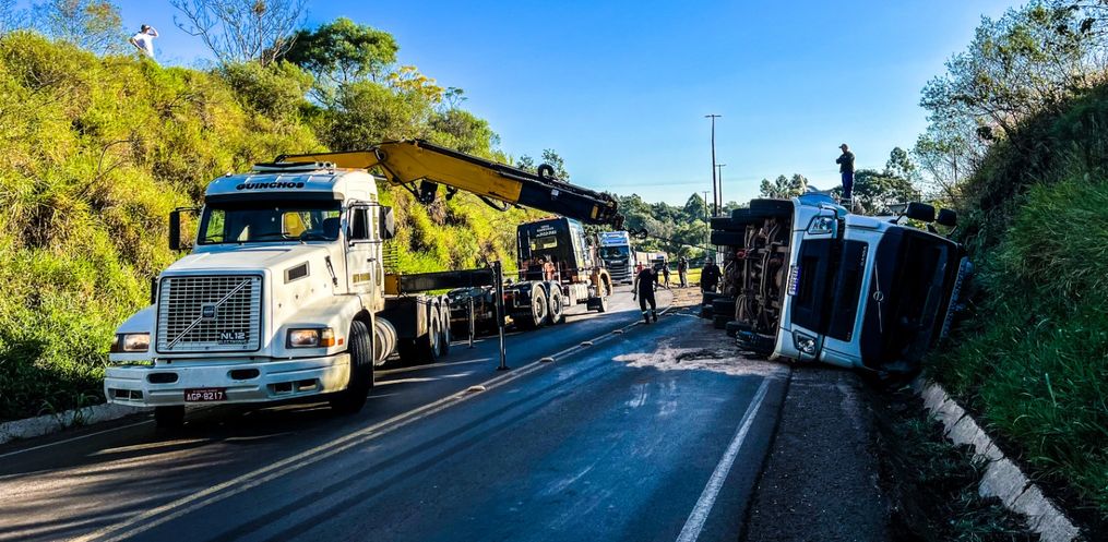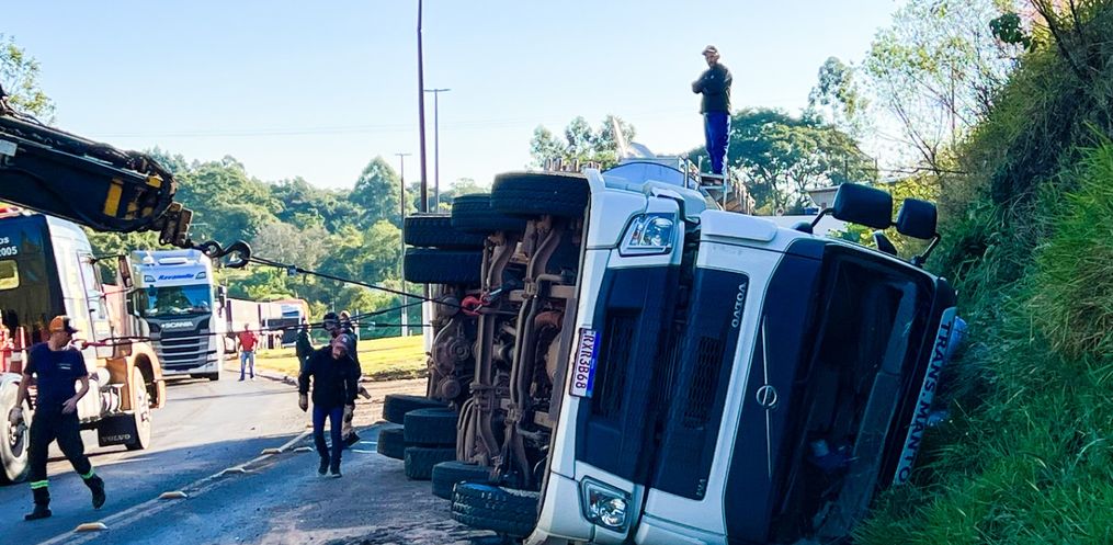 O caminhão envolvido é um Volvo-330 com placas de Guaruja do Sul. O veículo era conduzido por uma mulher que teve escoriações e foi conduzida ao Hospital. Ela seguia sentido a São Miguel do Oeste quando aconteceu o tombamento.