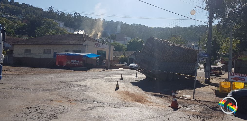 O trânsito ficou parcialmente bloqueado. Durante a tarde será transferida a carga para outro caminhão. Ninguém ficou ferido.