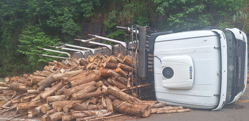 Um caminhão tombou na manhã desta sexta-feira, 16, por volta das 11h30, no km 73 da SC-161, em Flor do Sertão. O veículo, um Scania G 420, transportava madeira e acabou ocupando as duas pistas da rodovia.