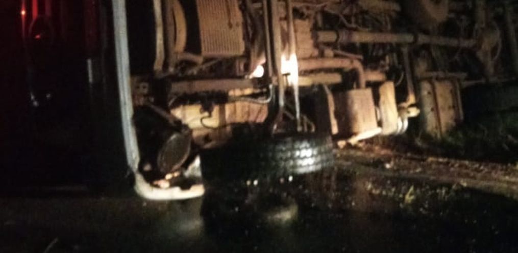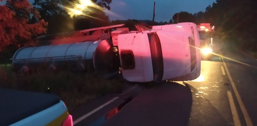 Guarnições do Corpo de Bombeiros de Mondaí foram acionadas para atender o capotamento de um caminhão leiteiro. Chegando no local, o caminhão foi encontrado tombado obstruindo parcialmente a rodovia.
