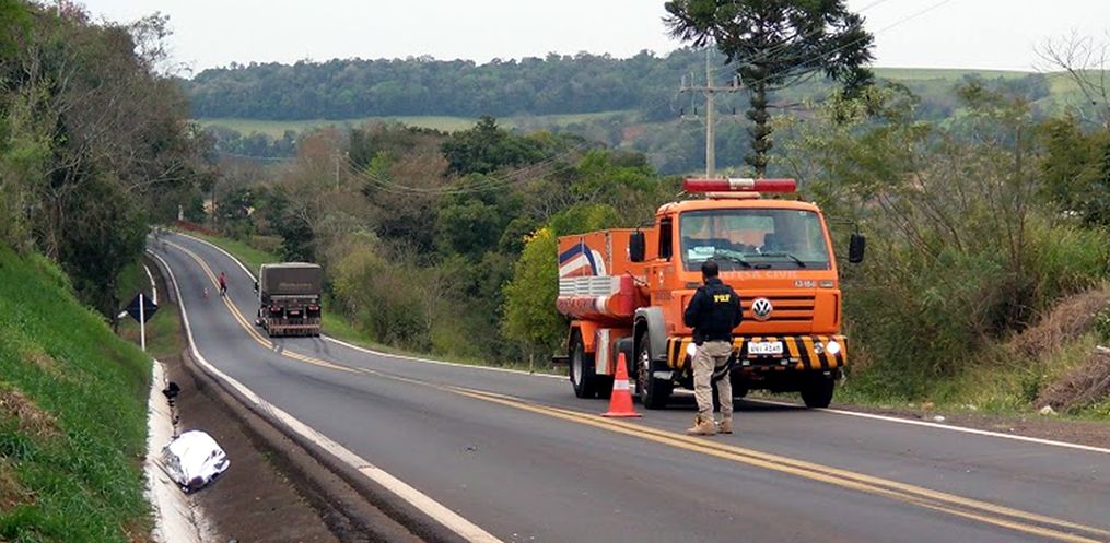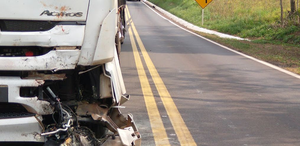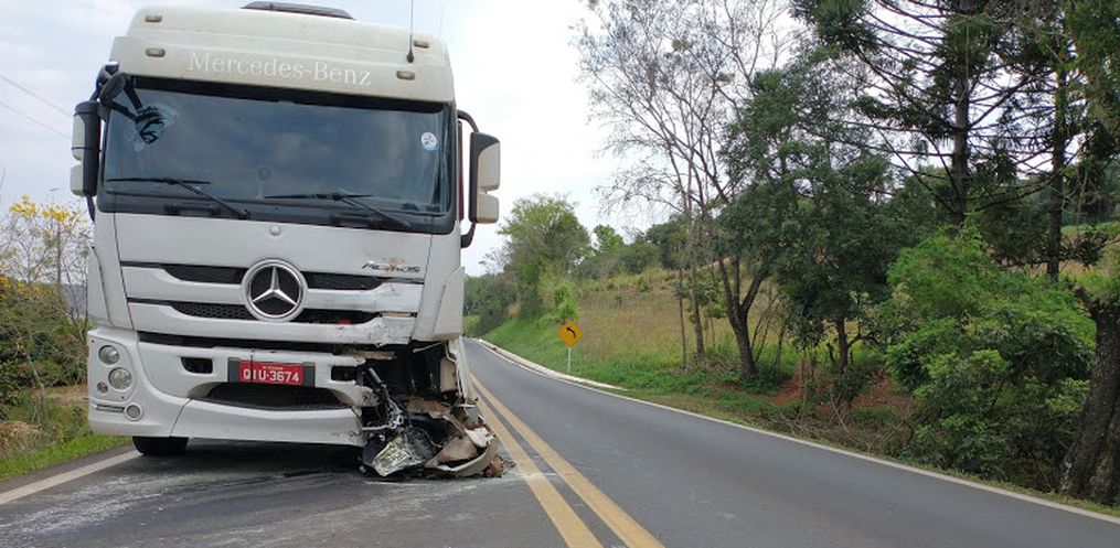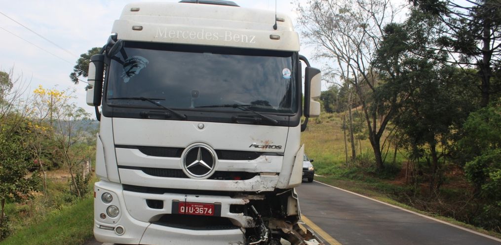No local houve uma colisão frontal, envolvendo um caminhão Mercedes Benz, placas de Descanso/SC, e uma motocicleta Honda NXR 150, cuja placa não foi possível identificar.