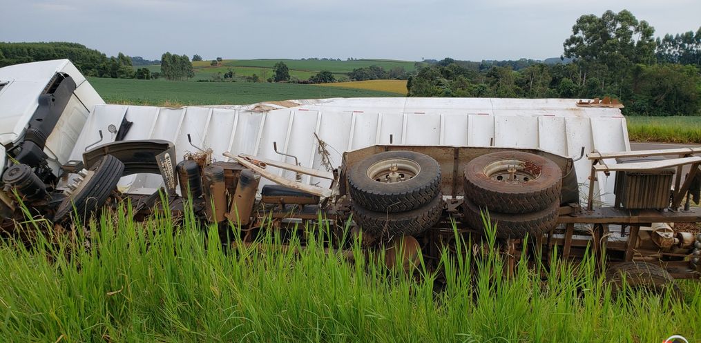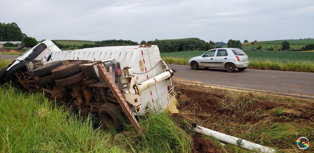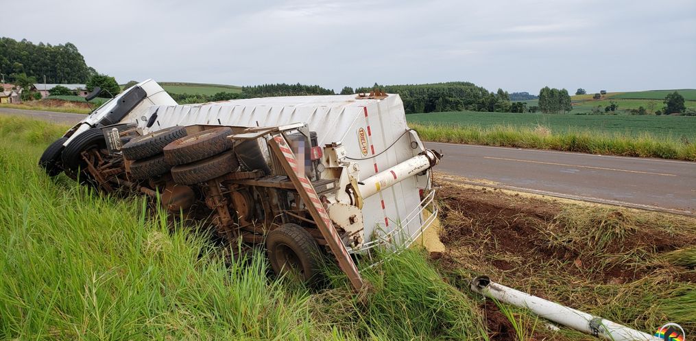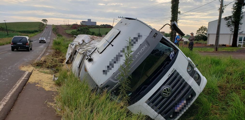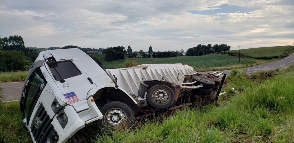 Um caminhão carregado com ração saiu da pista e tombou às margens da rodovia SC 163, em Iporã do Oeste, no início da manhã deste sábado, 25.