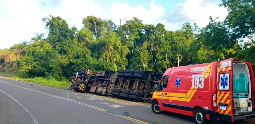 O veículo envolvido é um caminhão Scania. No local, os socorristas encontraram o condutor, um homem de 33 anos, fora do caminhão, sentado no chão, consciente e orientado. Ele apresentava lacerações nos braços e pernas.