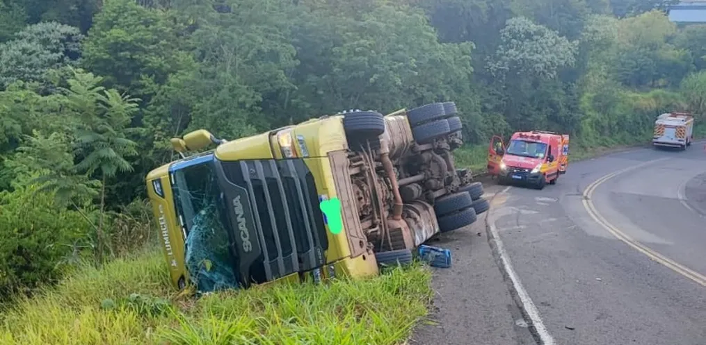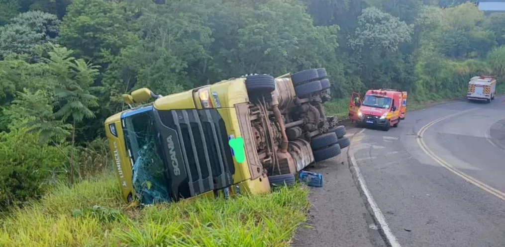 Um caminhão saiu da pista e tombou na SC 161, em Romelândia, na manhã desta segunda-feira, 9.