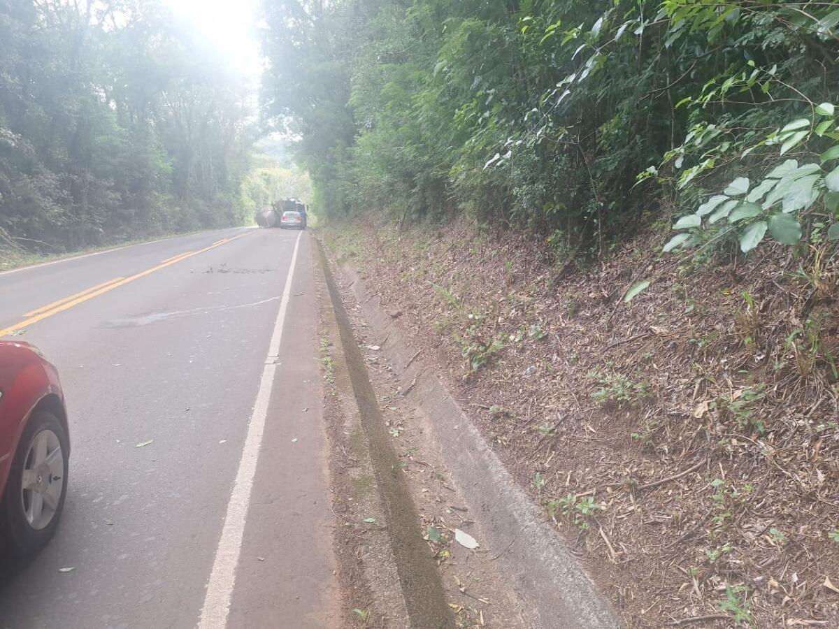 Um caminhão saiu da pista e tombou na madrugada desta quarta-feira, 15, por volta das 5h40, na SC-305, no km 79,200, em Guaraciaba.