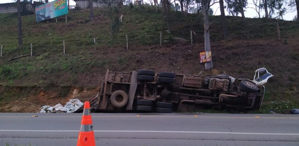 Por volta das 5h, um caminhão Ford Cargo 1618 tombou fora da pista. O motorista não resistiu aos ferimentos e morreu no local.