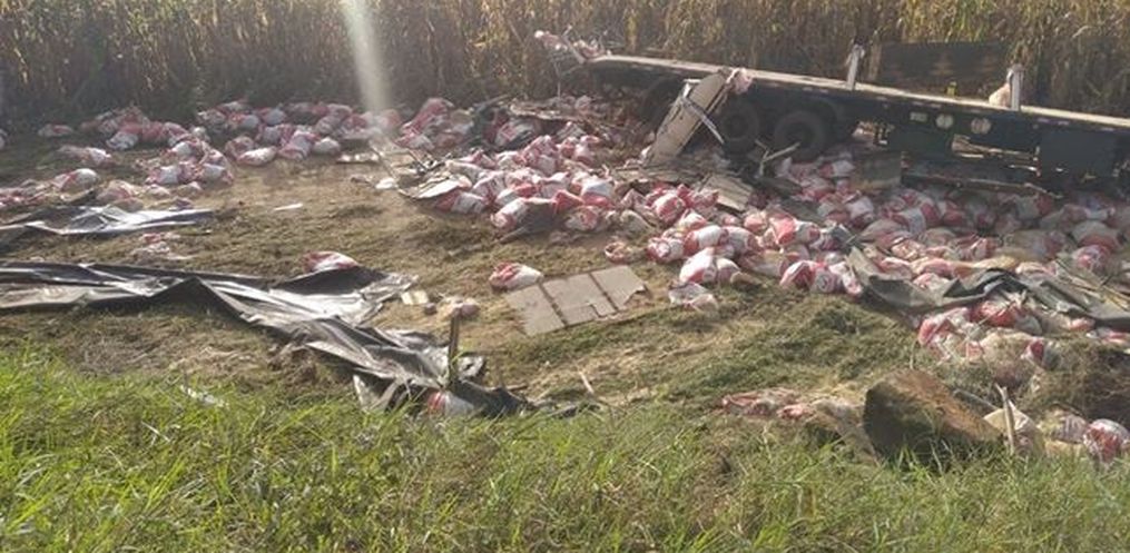 Os socorristas foram ao local e atenderam uma saída de pista seguida de capotamento de carreta Scânia P380, com placas de Rondonópolis/MT. O veículo estava carregado de ração e trafegava sentido Anchieta para Romelândia.