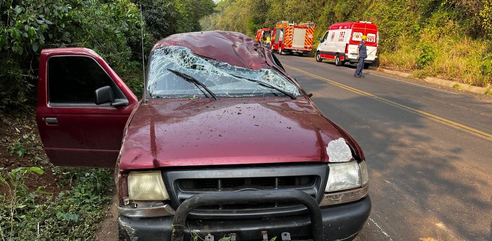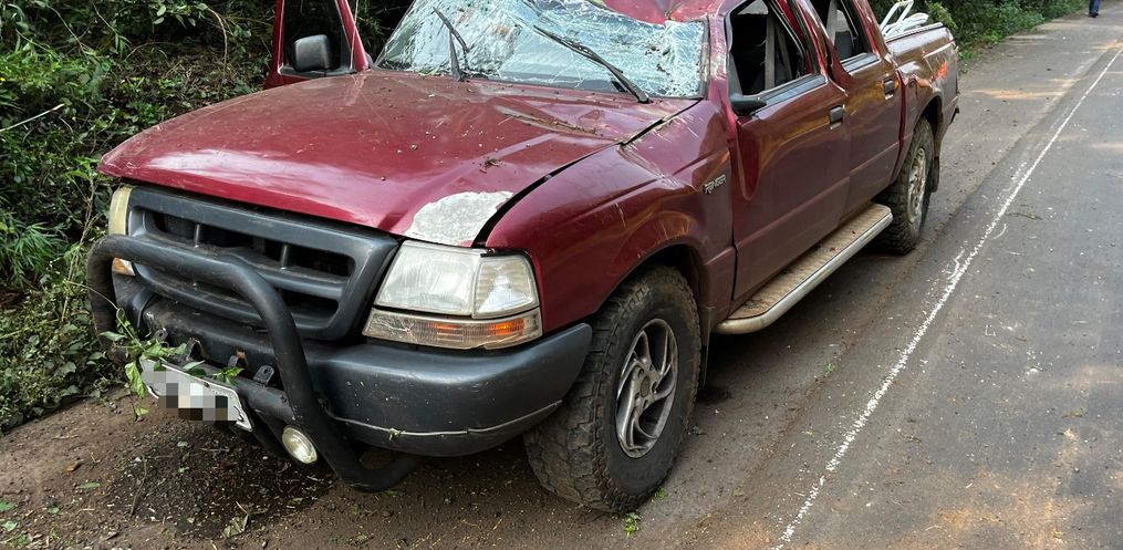 Uma Ford Ranger saiu da pista e capotou por volta das 15h30 desse sábado, 7, na BR 282, proximidades da ponte sobre o Rio das Antas, trecho entre São Miguel do Oeste e Maravilha.