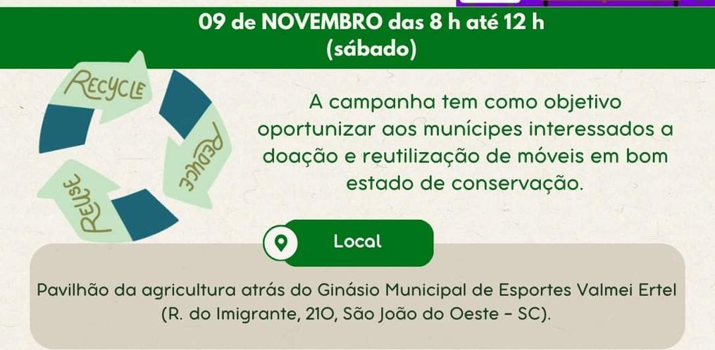O município de São João do Oeste vai realizar neste sábado, 09, a doação de móveis usados, oriundos de descarte realizados pela população durante a campanha de Recolha de Móveis Usados, que teve início no dia 14 de outubro e encerra nesta sexta feira, 08.