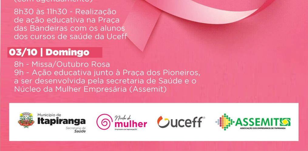 Itapiranga terá três dias de programações do Outubro Rosa. A campanha é alusiva ao movimento internacional de conscientização para controle do câncer de mama e do colo do útero.