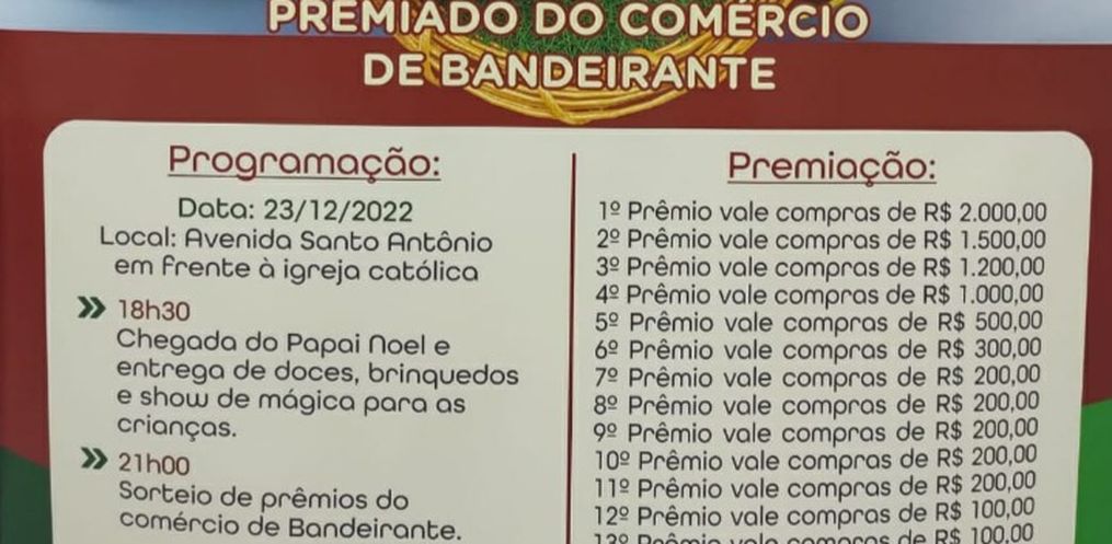 O sorteio será realizado no dia 23 de dezembro na avenida Santo Antônio em frente à Igreja Católica e na programação às 18:30h chegada do Papai Noel com entrega de doces, brinquedos e show de mágica para as crianças, às 21:00h sorteio e após animação musical.