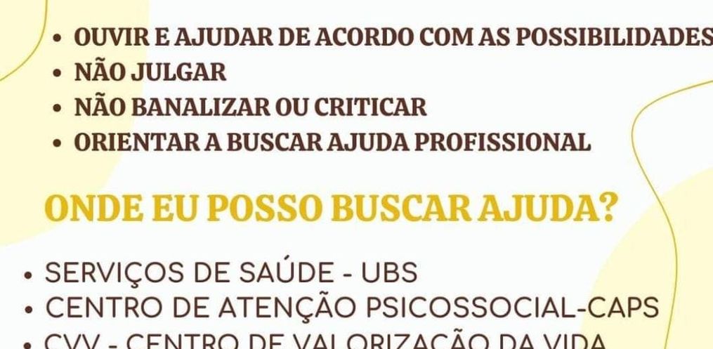 Está chegando o Setembro Amarelo, que é a campanha de conscientização para prevenir o suicídio, e Campo Erê vai receber um palestrante especializado no assunto para conversar com os profissionais e também com os adolescentes nas escolas. Viviane destaca que é preciso trabalhar o tema o ano inteiro e a ideia inicial é envolver o comércio também.