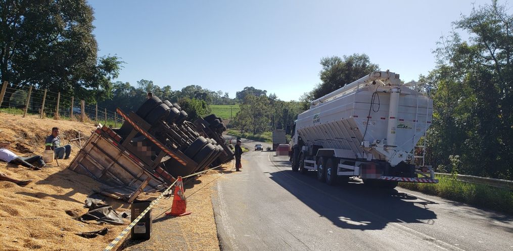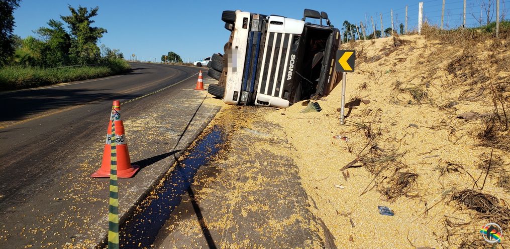 Uma carreta carregada com milho tombou às margens da rodovia SC-163, por volta das 15h deste domingo, 02, na Linha São Valentim, interior de Descanso.