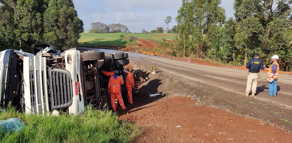 Saída de pista com caminhão deixa motorista ferido no interior de São Miguel do Oeste