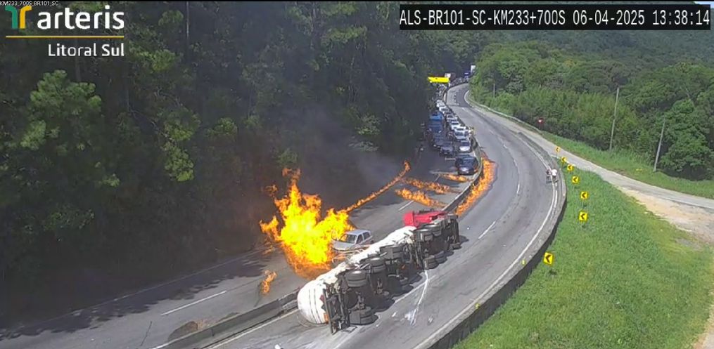 Uma carreta carregada de combustível tombou no Km 233 da BR-101, sentido Sul, em Palhoça, na Grande Florianópolis, no início da tarde deste domingo (6). Com o acidente, que aconteceu na altura do Morro dos Cavalos, a carga explodiu e pegou fogo.