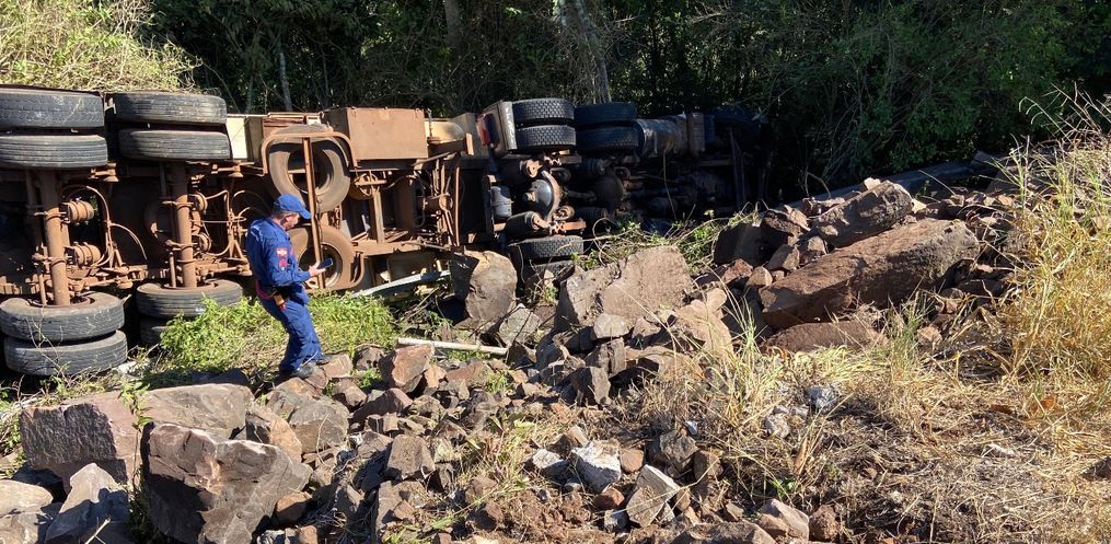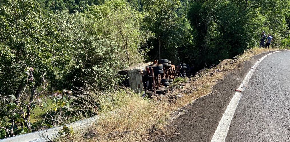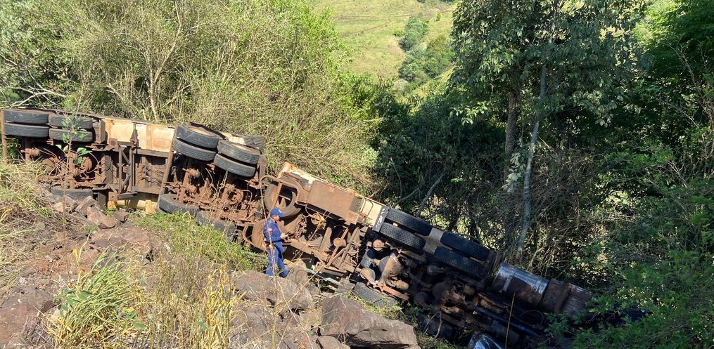 Uma carreta saiu da pista e caiu em uma ribanceira às margens da SC 492, em uma curva no município de Barra Bonita. O acidente foi por volta das 09h15 desta terça-feira, 10.