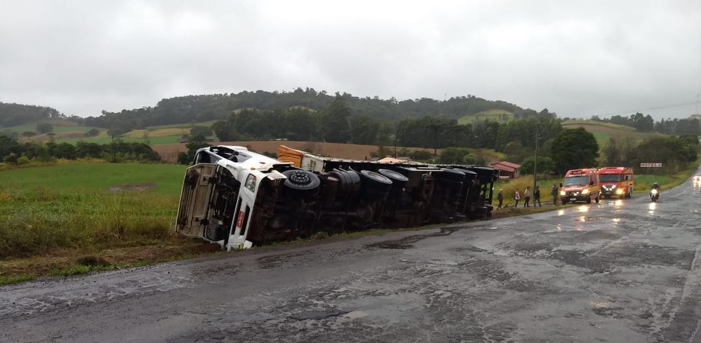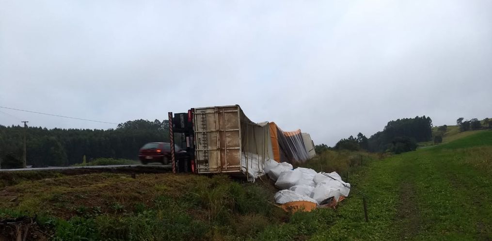 No local foi constatada uma saída de pista com tombamento de uma carreta Iveco com placas de São Gabriel/RS que estava carregada com bag’s de adubo. Chovia no momento.
