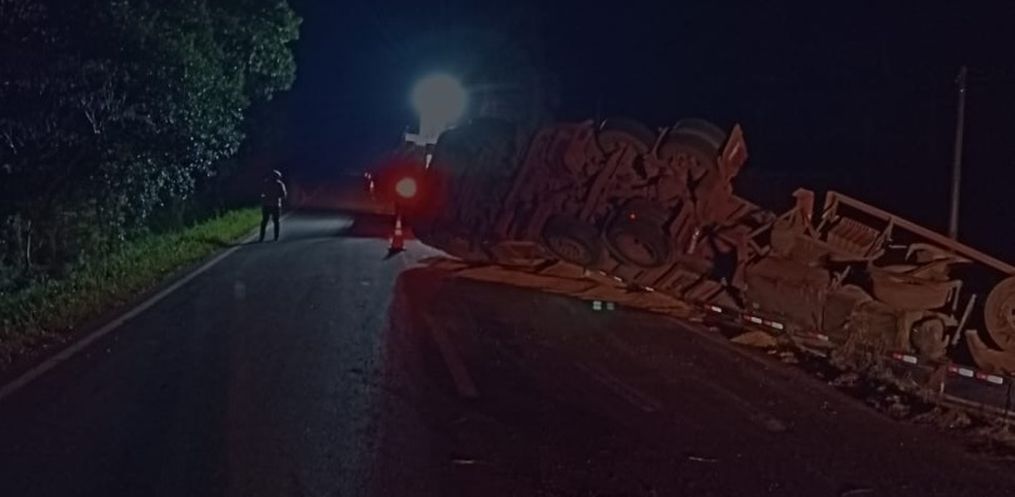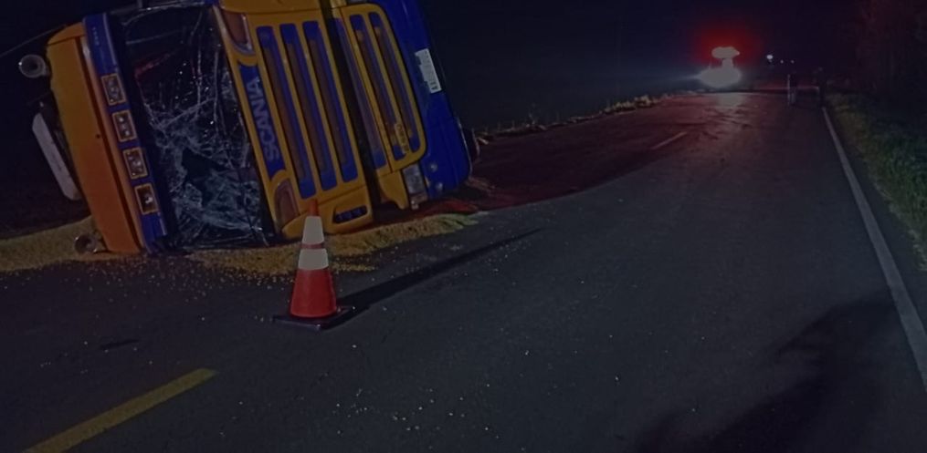 No local, foi confirmada a saída de pista seguida de tombamento de uma carreta Scania R420, com placas do Paraguai. O veículo, que transportava mais de 33 toneladas de milho, ficou parcialmente sobre a rodovia, bloqueando parte da pista.