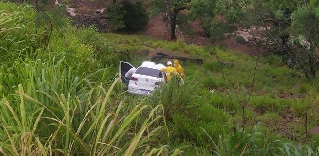 Quando os bombeiros chegaram no local da ocorrência, o carro estava em um barranco a cerca de 20 metros da estrada.