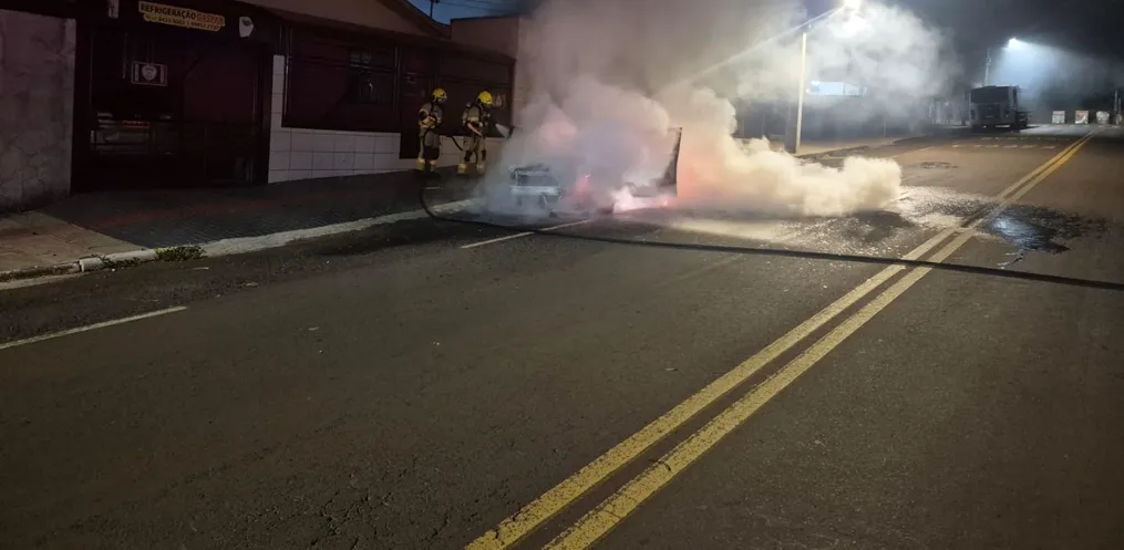 Um veículo de passeio foi destruído por um incêndio na madrugada desta segunda-feira, 09, por volta das 3h40, na Rua Emilio Allet, em Xanxerê.