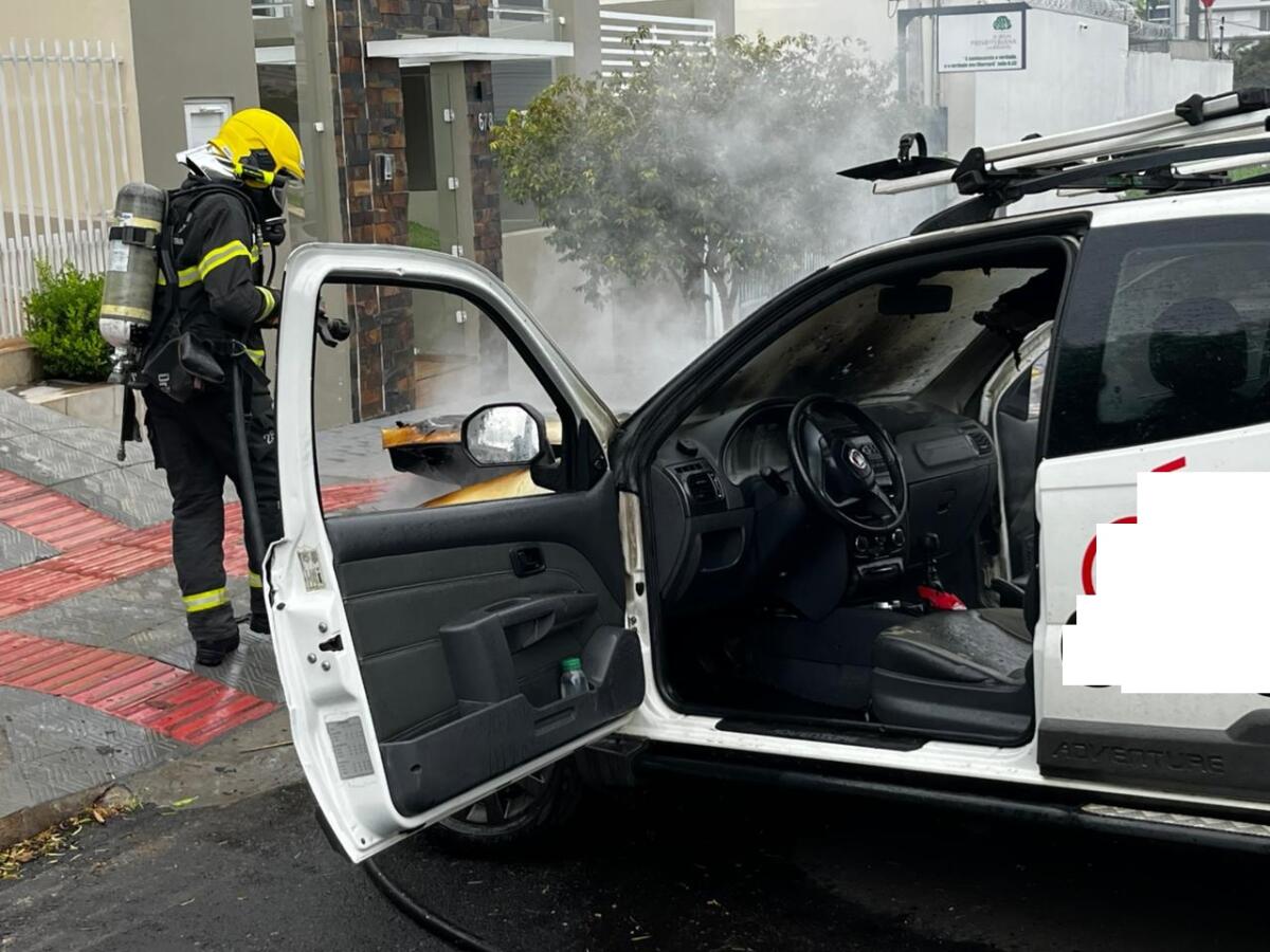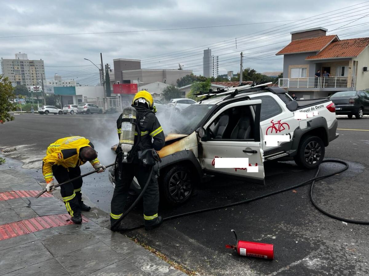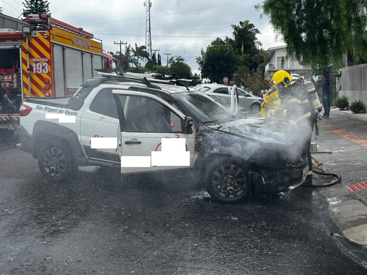 Uma Fiat Strada, com placas de São Miguel do Oeste, ficou parcialmente destruída ao pegar fogo na manhã desta quinta-feira, 16, por volta das 11h30, na Rua Rui Barbosa, no centro da cidade.