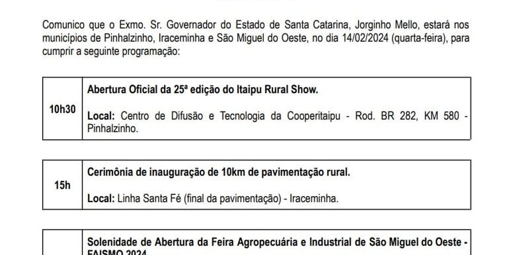 A cerimônia de abertura oficial da Faismo 2024 vai contar com a presença do governador Jorginho Mello. A Casa Militar do governo confirmou a viagem de Jorginho para o extremo-oeste na próxima quarta-feira, 14. As 10h30, ele vai participar da abertura do Itaipu Rural Show em Pinhalzinho. As 15h, Jorginho estará em Iraceminha para a cerimônia de inauguração de 10 km de pavimentação rural na linha Santa Fé. A agenda do dia será concluída com a participação de Jorginho Mello na abertura oficial da Faismo as 19h.